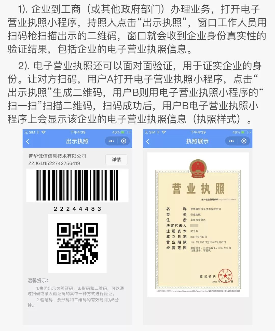 通过电子营业执照小程序,企业可以实现电子营业执照的出示,电子营业执照真伪性验证等功能。